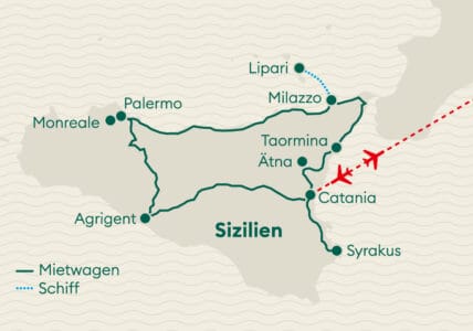 Entdecken Sie auf dieser Mietwagenreise die faszinierende Schönheit und Vielfalt dieser mediterranen Inseln. Sie fahren nach Syrakus und erkunden Sie die antike Stadt. Weiter geht es nach Ragusa, bekannt für seine barocke Architektur, und Agrigent mit dem faszinierenden Valle dei Templi. In Palermo tauchen Sie ein in die reiche Geschichte und Kultur der Hauptstadt Siziliens. Mit dem Tragflügelboot erreichen Sie Lipari und bleiben 2 Nächte, um die atemberaubende Schönheit der Äolischen Inseln zu erleben. Letzter Halt ist Taormina, von hier aus erkunden Sie den imposanten Ätna.